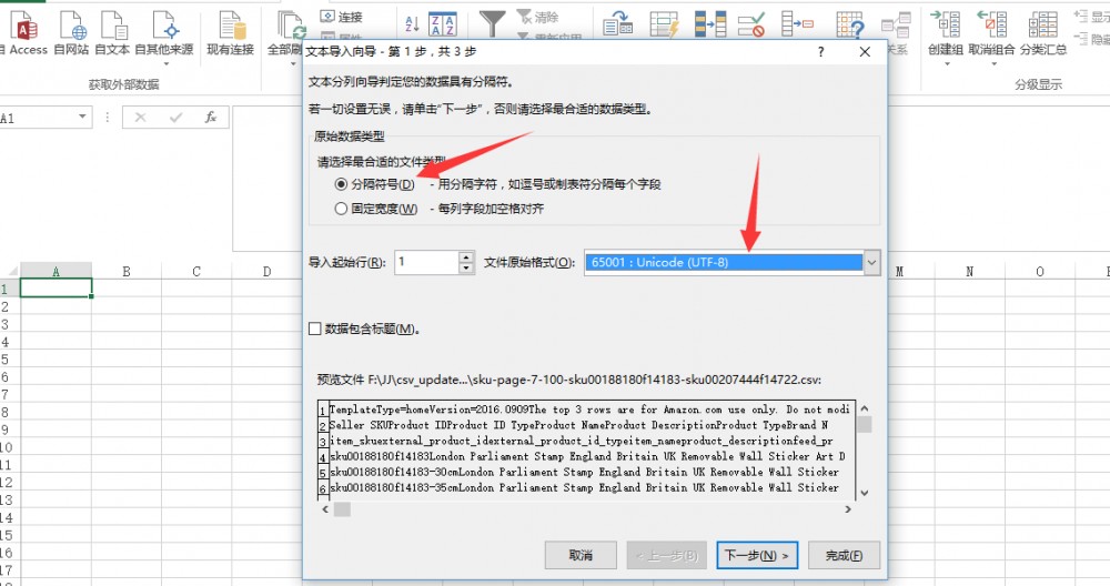 3.选择需要转换的文件,设置“文件类型”为“分隔符号”,设置文件原始格式为“65001:Unicode(UTF-8)”,然后点击“下一步”