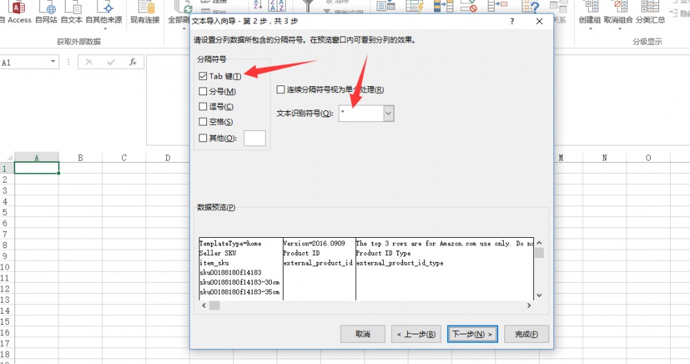 4.设置“分隔符号”为“Tab键”,“分本识别符号”为双引号,点击“下一步”