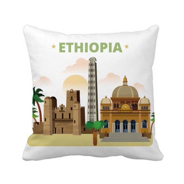 手绘城市棕榈树古堡建筑埃塞俄比亚文化元素 方形抱枕靠枕沙发靠垫双面含芯礼物