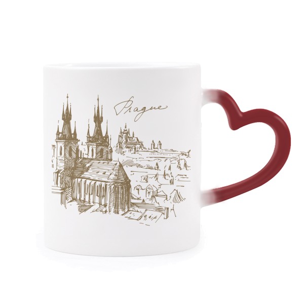 布拉格广场捷克地标图案 加热变色陶瓷马克杯红色心形把手